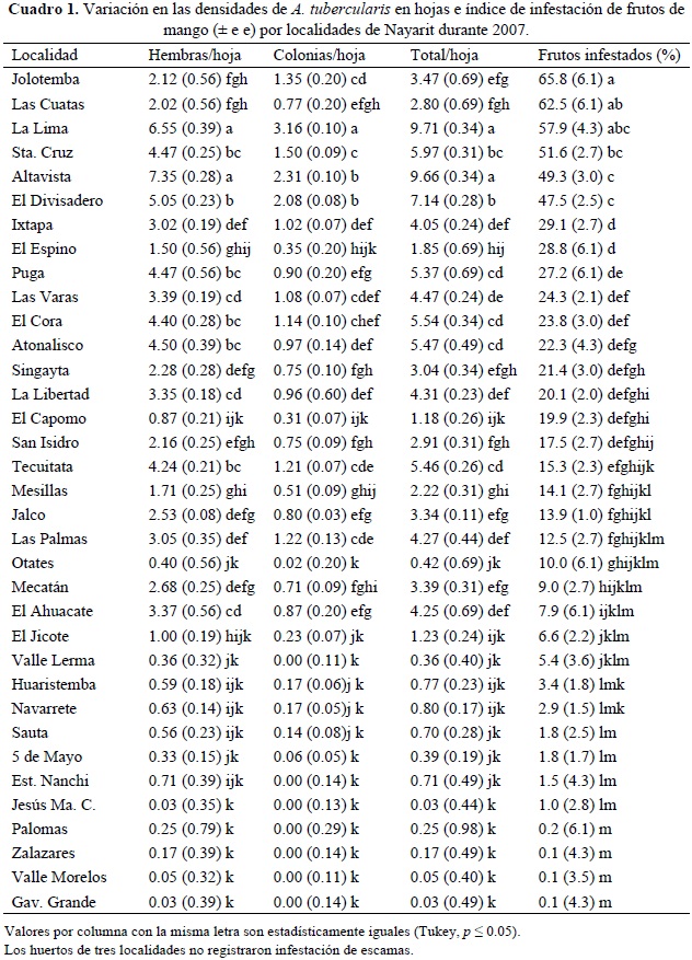 Distribución por localidades. En el primer año se detectaron diferencias en las poblaciones de EB. Los huertos de mango con las densidades poblacionales más altas fueron aquellos localizados en La Lima y Altavista, (municipio de Compostela), donde se registraron en promedio 3.16 y 2.31 colonias/hoja y un total (colonias más hembras) de 9.71 y 9.66 escamas/hoja, respectivamente (Cuadro 1). Poblaciones moderadamente altas se detectaron en huertos de los poblados El Capomo y San Isidro, donde las densidades de hembras+colonias fueron de más de una a menos de dos escamas/hoja en cada caso. Los huertos de poblaciones de Valle Morelos Gavilán Grande y Jesús Ma. Corte registraron las poblaciones más bajas, con valores no mayores a 0.05 hembras+ colonias/hoja. Respecto a la escama en frutos, seis huertos presentaron una infestación superior al 40% (Cuadro 1). Algunos huertos con alta infestación de escamas en follaje no necesariamente registraron la mayor infestación de frutos (v.gr. Jolotemba y Las Cuatas), pero en general, huertos con bajas infestaciones de escama en follaje registraron bajas infestaciones de frutos (Cuadro 1). De las 38 localidades visitadas, solo las de Pozo de Villa, El Limón y Puerta de Mangos, del municipio de Santiago Ixcuintla, no registraron ninguna infestación.