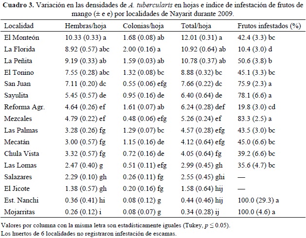 Los huertos de mango localizados en poblaciones al sur del estado, presentaron las mayores densidades de escama blanca en el follaje, así como las mayores infestaciones de frutos.