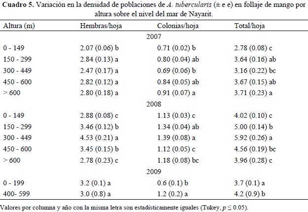 En el último muestreo (2009), solamente se consideraron dos intervalos de altura. De éstos, el de 400-599 msnm, registró el mayor promedio de colonias/hoja (1.6) y total de hembras+ colonias/hoja (4.2), comparado con el intervalo de 0-199 msnm (Cuadro 5). En cambio, la mayor infestación de frutos se observó en el intervalo cercano al nivel del mar (0-199), con un promedio de 53.8% de frutos infestados contra 45% en huertos de 400-599 de altura.