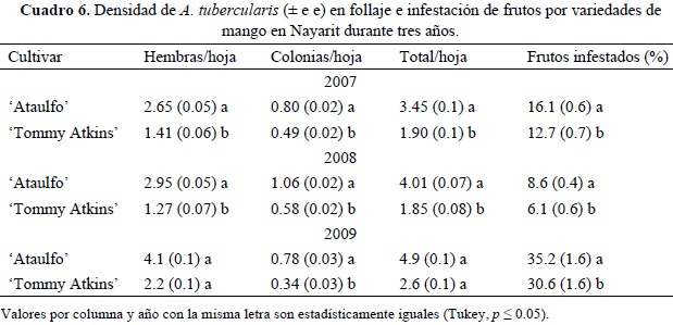 Las observaciones realizadas indican que los bajos niveles de infestación de frutos en 2008 se debieron probablemente a la presencia de "mango niño" (fruto partenocárpico), que en apariencia fue mayor que otros años, aunque esta variable no fue evaluada. Por otra parte, las diferencias detectadas entre los dos cultivares, probablemente se deba a que, en términos generales, los huertos de 'Tommy Atkins' son normalmente más viejos que los de 'Ataulfo' y presentaron ramas viejas con poco rebrote y con follaje escaso, lo cual no favorecería el desarrollo óptimo de la escama. Además, con esta condición se podría genera una menor cantidad de alimento para la escama y una mayor ventilación interna en el dosel, eliminando así la humedad relativa necesaria para el desarrollo de los insectos. Con esta condición de los árboles, además de disponer la escama de menor cantidad de alimento, existe mayor ventilación interna en el dosel lo que no genera una humedad relativa adecuada para el desarrollo de las escamas. Por otra parte, la infestación de frutos fue consistente con la infestación en follaje, ya que tanto en 'Ataulfo' como en huertos de menos de 10 años de edad ocurrieron poblaciones más altas en el follaje y en los frutos (Cuadros 6 y 7).