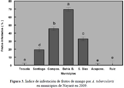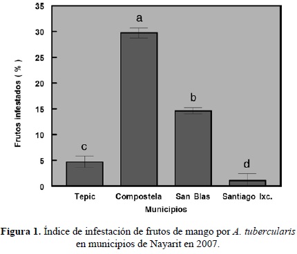 Distribución por municipio. En 2007, se encontraron diferencias significativas entre los municipios productores de mango estudiados. En los huertos de Compostela se registraron las densidades de población más altas, con 3.23 hembras/hoja y 1.15 colonias por hoja, en promedio. En esta misma localidad, el total (hembras+colonias) fue también bastante alto (4.39/hoja), comparado con el resto de los municipios (Cuadro 4). Otros municipios con un grado importante de infestación fueron San Blas y Tepic con 3.16 y 1.13 escamas/hoja, respectivamente. Los huertos de Santiago Ixcuintla presentaron las densidades más bajas al promediar 0.23 hembras/hoja, 0.03 colonias/ hoja y un total (hembras+colonias) de 0.27 escamas/hoja (Cuadro 4). Por otra parte, se detectaron diferencias significativas en el porcentaje de frutos infestados entre municipios. En Compostela se encontró la mayor infestación de frutos (29.7%), seguido de San Blas (14.6%), Tepic (4.7%) y Santiago Ixcuintla (1.1% (Fig. 1).