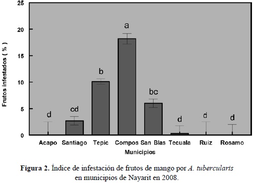 En 2008, también se detectaron diferencias significativas entre municipios. El número más alto de hembras/hoja se registró en Compostela (4.0), seguido de Tepic (3.2) y San Blas (3.01) (Cuadro 4). El promedio más bajo se registró en Tecuala (0.02), mientras que en Ruiz y Rosamorada no se encontraron hembras. De igual manera, la mayor cantidad de colonias/hoja correspondió a Compostela (1.6), el número más bajo se registró en Tecuala (0.01) y no se detectaron colonias en Ruiz y Rosamorada. Con relación al total de escamas (hembras+colonias), la mayor densidad se manifestó en los huertos de Compostela con 5.5, seguidos por los de Tepic (5.0) y San Blas (4.24). El promedio más bajo de total de escamas se observó en Tecuala (0.03). Con respecto al porcentaje de frutos infestados, también ocurrieron diferencias entre municipios, siendo Compostela el que registró la mayor infestación en frutos (18.2%) y Tecuala el más bajo (0.3%) (Fig. 2).