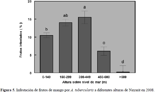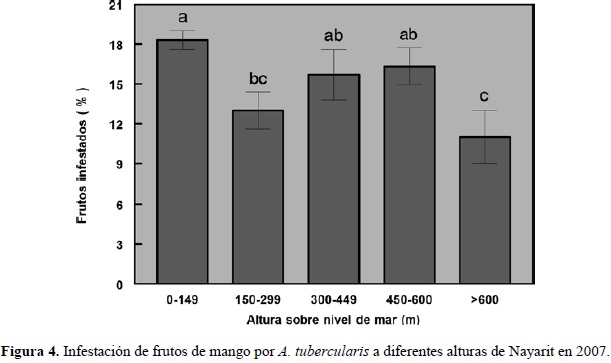 Distribución por alturas. Durante el periodo de muestreo, se detectaron diferencias significativas entre huertos situados a diferentes alturas sobre el nivel del mar. En el primero de ellos (2007), las poblaciones fueron mayores en huertos situados por arriba de los 600 msnm, con 2.8 hembras, 0.91 colonias y 3.71 total/hoja (Cuadro 5). Contrario a lo esperado, el promedio más bajo se presentó en huertos cercanos al nivel del mar (no más de 149 msnm), con 2.07 hembras, 0.71 colonias y 2.78 total/hoja. Por otra parte, la infestación de frutos también varió a diferentes alturas. El registro más alto se localizó entre 0-149 msnm (18.3%) y el más bajo (11%), por arriba de los 600 msnm (Fig. 4).