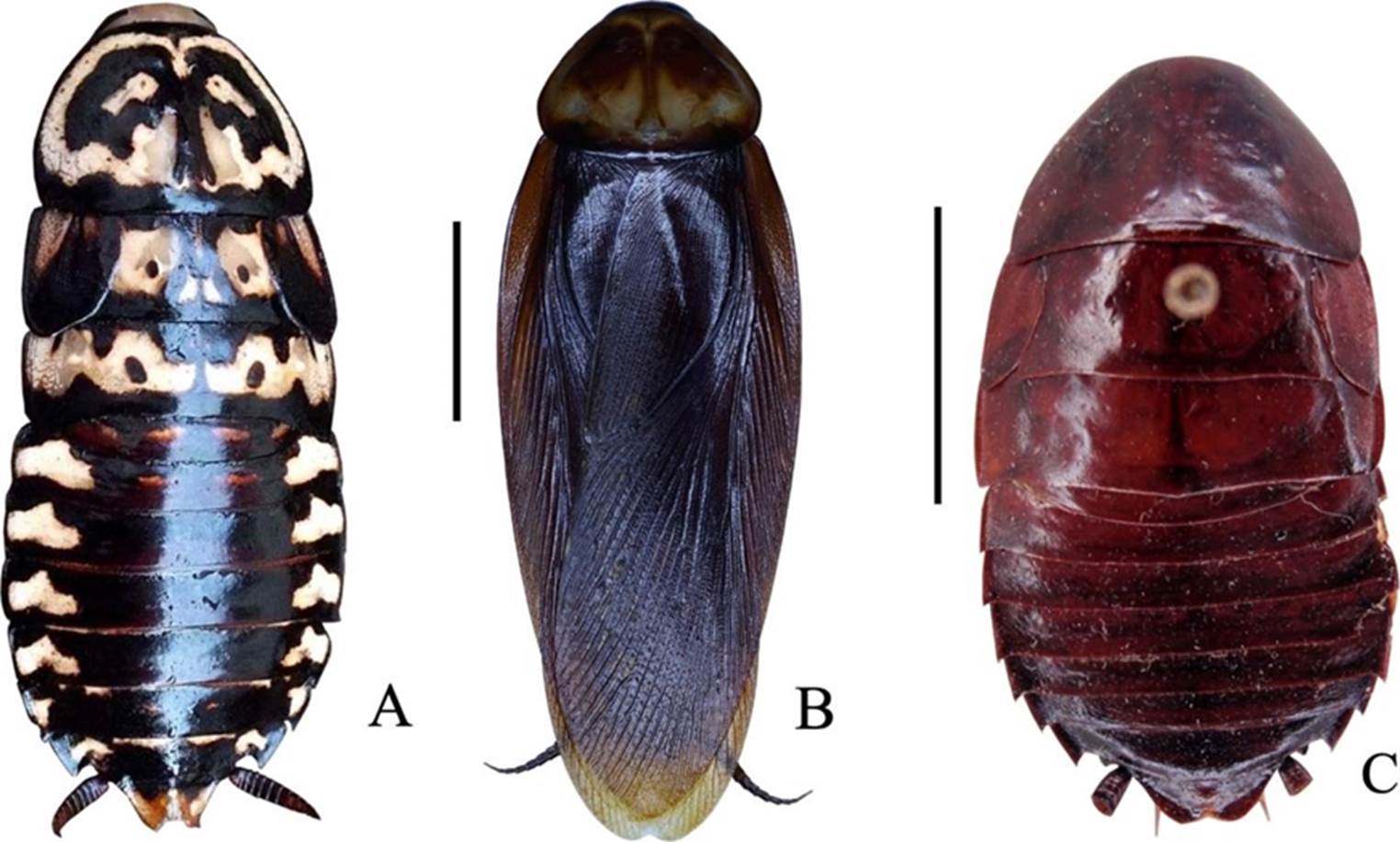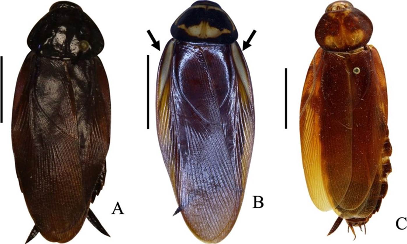 Figura 3 Vista dorsal de tres especies de Blattidae. A) Neostylopyga rhombifolia, ♀, sin barra de escala, foto de Lenny Worthington; B) Periplaneta americana, ♂, barra de escala = 10 mm; C) Eurycotis lixa, ♂ holotipo (decolorado), barra de escala = 10 mm, foto de Heidi Hopkins.