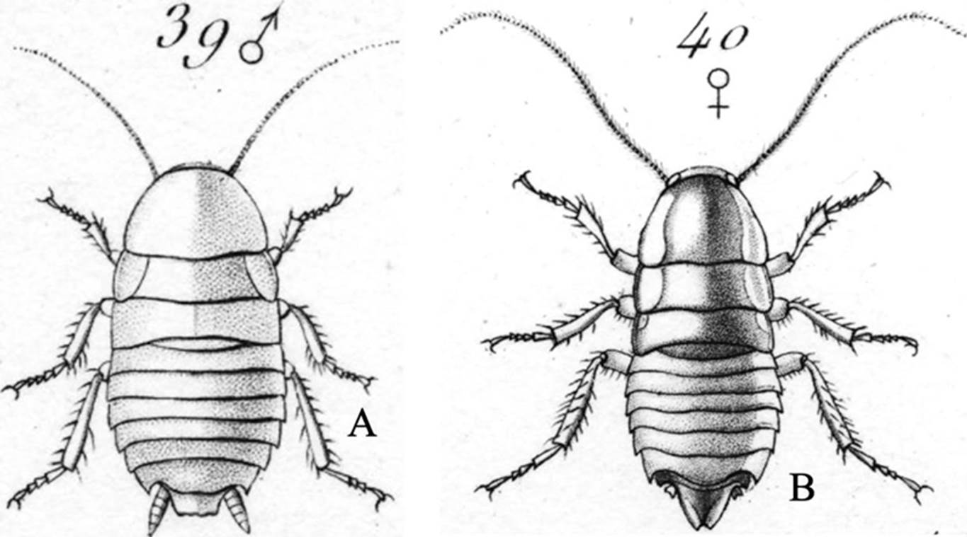 Figura 8 Ilustraciones de dos especies de Eurycotis, sin barra de escala, tomadas de Saussure (1870). A) Eurycotis mexicana, ♂; B) Eurycotis mysteca, ♀.