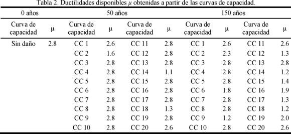 En la tabla 2 se muestran las ductilidades disponibles globales obtenidas de cada curva de capacidad CC # correspondientes a 0 (sin daño), 50 y 150 años, respectivamente (figuras 5a y 5b). Las ductilidades están calculadas a partir del cociente de la distorsión máxima en la azotea entre la distorsión de fluencia del sistema.