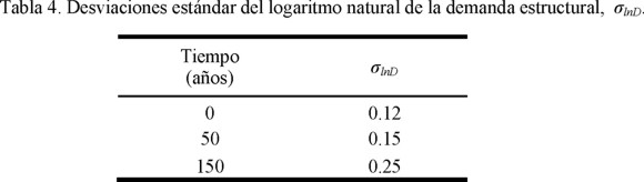 En la tabla 4 se presentan las desviaciones estándar del logaritmo natural . Cabe mencionar que los valores de las desviaciones estándar del logaritmo natural de la demanda se incrementan a medida que el intervalo de tiempo crece. Esto se debe a que mientras más grande es el intervalo de tiempo, mayor es la probabilidad de que la estructura esté sometida a más movimientos sísmicos intensos, por lo que se acumula mayor daño estructural. Esto se refleja en que la estructura presenta un número mayor de elementos con articulaciones plásticas y/o estas desarrollan mayor ductilidad ante la acción de dichos movimientos. El comportamiento dinámico no lineal de dichos elementos correspondientes a estructuras sujetas a un conjunto de historias aleatorias de aceleración da lugar a una mayor variabilidad de la respuesta estructural.