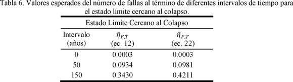 El ejemplo de aplicación hace ver que el deterioro estructural de las propiedades mecánicas tiene influencia no solamente en la capacidad estructural sino también en la demanda (como función de la intensidad). Esto se reflejó en el hecho que el número esperado de fallas en un intervalo de tiempo,