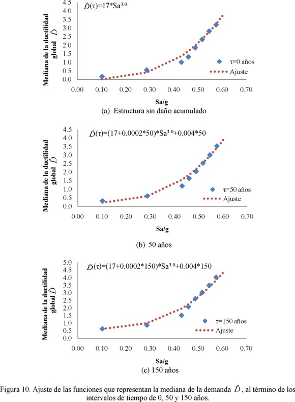 ) con la intensidad (Sa/g). En estas figuras se puede observar que mientras más grande es el intervalo de tiempo (por consecuencia más daño estructural acumulado), los valores de la mediana de la demanda se incrementan. La expresión que ajusta a la mediana de la demanda