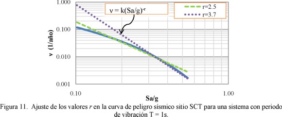El parámetro r corresponde a la curva de peligro sísmico de la forma , donde k y r son constantes que se ajustan a la forma de la CPS para la intensidad de interés. En la figura 11 se muestran los ajustes a la CPS correspondiente a T = 1s del sitio SCT. En este estudio se analizan resultados correspondientes a dos estados límite: a) estado límite de servicio para el que μ = 1, y b) estado límite cercano al colapso, para el que μ = 2.8. Los valores de las ductilidades para cada estado límite se estimaron a partir de la curva de capacidad sin daño (figuras 5a y 5b).