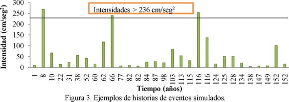 En este estudio solo se incluyeron intensidades mayores que 236 cm/seg2 ya que se observó que intensidades menores solo producían niveles de daño despreciables. Este valor se seleccionó a partir de la ordenada espectral para el periodo T=1.1s del espectro de pseudoaceleraciones del registro obtenido en el sitio SCT el 19 de septiembre de 1985 en la Ciudad de México. El periodo T=1.1s corresponde al periodo fundamental del edificio en estudio. En la figura 3 se muestra un ejemplo de las intensidades de eventos simulados.