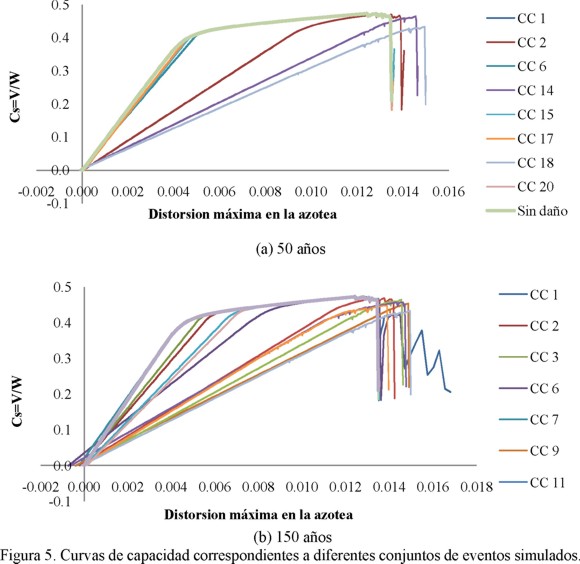 En las figuras 5a y 5b se muestran las diferentes curvas de capacidad global (CC) correspondientes a distintos grupos de sismos (1, 2, 6,..., etc), en un instante de tiempo de 50 años y 150 años después de construida la estructura, respectivamente. Para efectuar los análisis dinámicos no lineales se utilizó en programa Drain 2D modificado (Campos y Esteva, 1997), donde los autores incorporan al programa un modelo de comportamiento histerético asociado al daño que presentan los elementos de concreto reforzado. El programa Drain 2D modificado está basado en el modelo de (Wang y Shah, 1987) y modificado con base en información experimental (Townsend y Hanson, 1997; Scribner y Wight, 1978; Uzumeri, 1997; Wang y Shah, 1987; Ma et al., 1976).