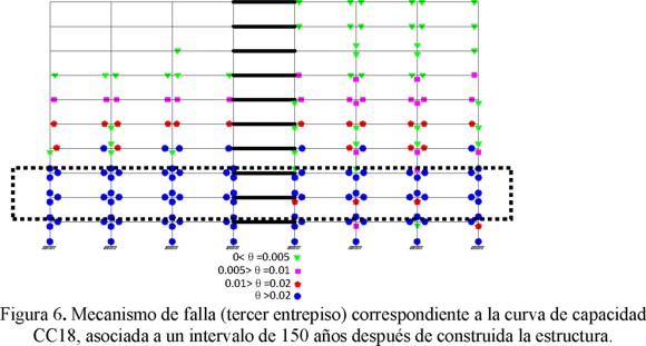 Se consideró que la falla estructural ocurría en el instante que se presentaba el mecanismo de falla, es decir, en el instante cuando se articulaban todas las vigas y columnas en un entrepiso. En la figura 6 se muestra un ejemplo de cómo se determinó la falla de la estructura para la curva de capacidad CC18, al término de 150 años después de construida la estructura (ver figura 5b).