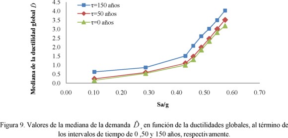 El comportamiento ascendente de la curva para τ = 0 años (estructura sin daño acumulado) en la Figura 9, obedece al hecho que la intensidad (Sa/g) crece hacia el lado derecho del eje de las abscisas. Un comportamiento similar lo muestran las curvas correspondientes a τ = 50 años y τ = 150 años, excepto que en estos casos la ordenada al origen también se incrementa al crecer el intervalo de tiempo de interés. Dicho incremento se debe a que la estructura presenta una deformación permanente al final del intervalo de tiempo (ya sea 50 ó 150 años). Dicha deformación permanente es consecuencia del daño que ha sufrido la estructura (que presenta un comportamiento no-lineal) como consecuencia de la acción de los movimientos sísmicos intensos.