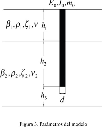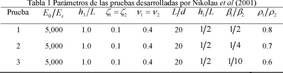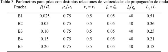 Nikolau et al (2001) analizan un modelo que contiene los parámetros que se muestran en la figura 3. Se analiza la respuesta estacionaria ( ω = ω1) de una pila individual que descansa en un medio compuesto de dos estratos sobre una base rígida. Se comparan tres casos de estudio con los parámetros dados en la tabla 1.
