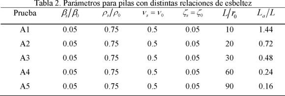 La tabla 2 muestra que la pila con menor relación de esbeltez ( L/r0 = 10) tiene un porcentaje de longitud activa mayor al 100%, lo que significa que toda la pila se encuentra influida por las fuerzas que se desarrollen en la cabeza, condición que produce que para el caso de la excitación en la cabeza, toda la pila se encuentra trabajando.