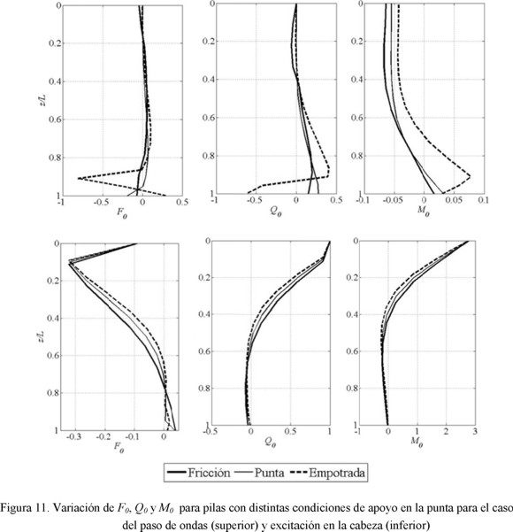 La diferencia entre las pilas es la condición de apoyo de la punta. Se consideró una pila de fricción, una pila de punta y una pila empotrada en la punta. La pila de fricción corresponde a una pila cuya punta se encuentra dentro del estrato blando (L = 36r0 ), en la pila de punta se considera que la punta se encuentra simplemente apoyada sobre el estrato duro, sin tener ninguna longitud de empotre (L = 40r0) y la pila empotrada corresponde a una pila cuya punta se encuentra embebida en el estrato duro (L = 44r0). La geometría de las tres pilas se presenta en la figura 10. Las curvas de F0, Q0 y M0 se presentan en la figura 11.
