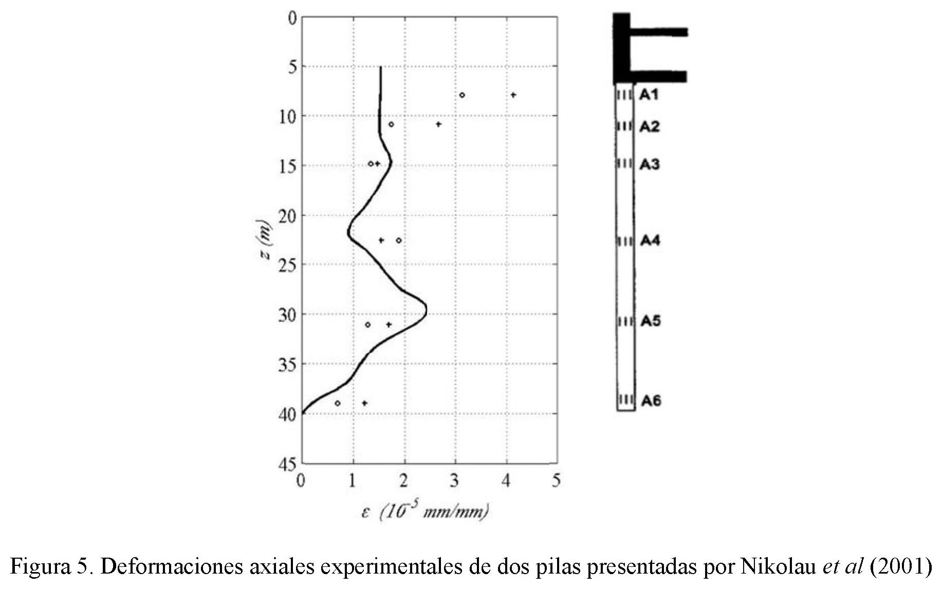 En los resultados experimentales que presentan Nikolau et al (2001) para dos pilas dentro de un mismo arreglo, se ve que efectivamente al nivel de la punta, la deformación unitaria axial debida al momento flexionante es diferente de cero, como se muestra en la figura 5.