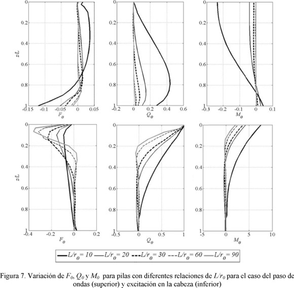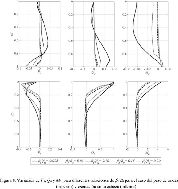 La pila tiene una relación de esbeltez L/r0 = 40. El medio estratificado tiene una variación de la velocidad de propagación de ondas de cortante (βs) de 35 m/s a 100 m/s en la longitud de la pila. El medio equivalente tiene una velocidad de propagación (βs) de 65 m/s y un espesor igual a la longitud de la pila. Las variaciones de F0, Q0 y M0 se muestran en la figura 12. Es claro que considerar un estrato equivalente produce una variación en la distribución de los empujes del suelo, la fuerza cortante y el momento flexionante ante el paso de ondas sísmicas. La forma de las curvas también cambia.