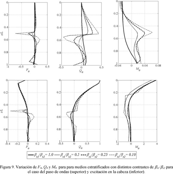 La presencia de estratos con distinta rigidez tiene una importante influencia en la distribución de los elementos mecánicos en las pilas producido por el paso de ondas sísmicas. Para evaluar dicha influencia, se estudia un medio compuesto de dos estratos. El estrato superior tiene un espesor de L/2. Las propiedades del estrato superior e inferior se denotan con los subíndices 1 y 2, respectivamente. Ambos estratos tienen las mismas propiedades excepto por la velocidad de propagación de onda. Los parámetros utilizados se presentan en la tabla 4. Las curvas de F0, Q0 y M0 se presentan en la figura 9.