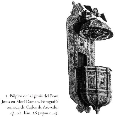 22 En este artículo, para tratar de interpretar nuestro púlpito de Daman, nos hemos referido deliberadamente a autores mexicanos o a investigadores cuyo primer campo de estudios ha sido el arte novohispano. Desde luego, ello no se debe a que los estudiosos portugueses no se hayan ocupado del arte barroco indoportugués, sino a la intención de señalar problemáticas paralelas que es posible establecer entre el mundo iberoamericano y el de las colonias portuguesas de las Indias Orientales en los siglos XVII y XVIII. Sería inaceptable, sin embargo, no mencionar por lo menos los nombres de los principales investigadores de origen portugués que han dedicado importantes estudios al tema, como Mário Tavares Chicó, Carlos de Azevedo, Maria Madalena de Cagigal, Pedro Dias, Jose Pereira, Teotonio R. de Souza y Vítor Serrão, sin olvidar, en lo que se refiere específicamente a los púlpitos, el reciente trabajo de Moreira de Frias, op. cit. A estos autores debemos la mayor parte de lo que se sabe respecto al barroco indoportugués.