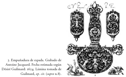 Efectivamente, en la recopilación ya clásica de Désiré Guilmard, Les maitres ornemanistes, hay un grabado fechado por este autor alrededor de 1624 y clasificado de la siguiente manera: "Escuela francesa, siglo XVII (1600), estilo Luis XIII" (fig. 3).8 Se trata de la representación de una empuñadura de espada y de dos conteras,9 ornamentadas todas con grutescos de profunda afinidad formal con algunos grabados de Étienne Delaune, el famosísimo orfebre francés del siglo XVI (ca. 1518-1583), cuyo nombre y estilo se relacionan íntimamente con la escuela de Fontainebleau.