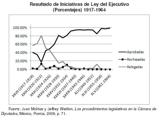Para mantener la estabilidad del sistema, el Ejecutivo utilizó su facultad constitucional que le permitía presentar proyectos de ley, que es una de las formas más sólidas para llevar a cabo la representación sustantiva en un sistema. El siguiente gráfico muestra cómo a partir de la fundación del partido oficial y con la estructuración del corporativismo, la presentación de iniciativas fue una acción programática casi exclusiva del Ejecutivo. Esto habla de la relevancia del Presidente de la República como centro de articulación y negociación en la política nacional. Asimismo, refleja el cauce institucional del sistema con un Ejecutivo que constantemente buscaba crear programas de gobierno para satisfacer las demandas de los sectores y así mantener la estabilidad del sistema.