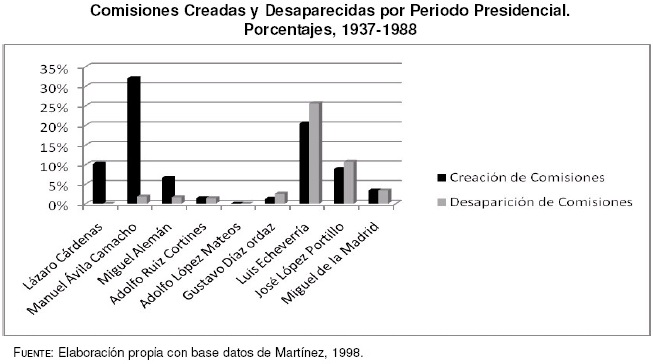 Comisiones Creadas y Desaparecidas por Periodo Presidencial. Porcentajes, 1937-1988