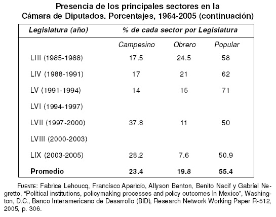 A estos dos factores puede añadirse un tercero, que era la capacidad presidencial para modificar la estructura legislativa en tanto que las comisiones funcionaban principalmente como arenas de negociación de temas distintos entre el Ejecutivo y los sectores. Asimismo, éstas representaban recursos importantes para el liderazgo partidista dentro de la Cámara, pues la colocación de un diputado en determinada comisión de su interés quedaba en manos de las cúpulas del partido en la legislatura.