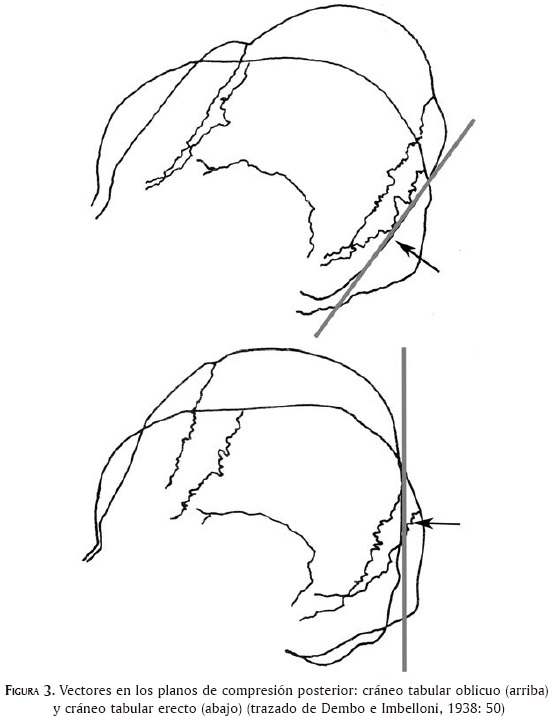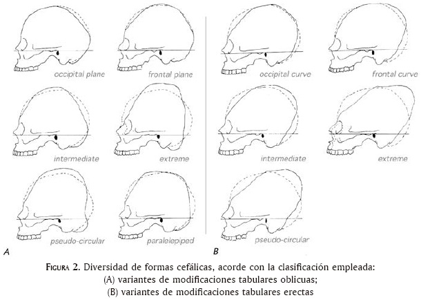 Para los fines de este trabajo nos hemos enfocado en las distribuciones formales en cada serie bajo estudio. Para la clasificación se empleó la tipología propuesta por Dembo e Imbelloni (1938), Romano (1965) y modificada por Tiesler (1998, 1999 y 2011), que distingue dos tipos principales: una, del tipo tabular erecta, la cual era lograda mediante la compresión de la cabeza en cunas; y otra, tabular oblicua, alcanzada gracias a la colocación de tablones sobre frente y occipucio de la cabeza infantil (figuras 2 y 3). Aparte se registraron diferentes grados y variantes de cada técnica.