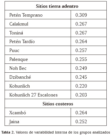 Como podemos apreciar en la tabla, a la población esquelética de Calakmul le corresponde el valor más alto que va a la par con la de Toniná, otro centro urbano que además mantenía lazos con diversas poblaciones en la zona limítrofe del territorio maya. Sigue en diversidad la ciudad de Palenque, o más bien la población de su centro urbano que fue objeto de este estudio, y luego Noh Bec (un sitio de transición), Dzibanché y finalmente Kohunlich. Sorprende a primera vista que los sitios costeros manifiesten una diversidad biológica similar a la de los grandes centros, pero se entiende por la elevada movilidad de las poblaciones costeras: por ello los separamos de la primera lista.4