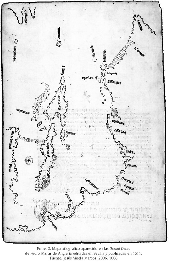 En Cuba, en el ambiente familiar de los expedicionarios, entre los cuales se encontraban algunos venidos tras el desastre colonizador de Castilla del Oro y por consecuencia enterados de las exploraciones istmeñas, la Tierra Firme estaba identificada con las costas que corrían desde el Golfo de Honduras hacia el Golfo de Paria (Venezuela) y más al sur hasta territorios que caían, por el Tratado de Tordesillas, bajo la soberanía portuguesa. Una visión que ha quedado plasmada en el mapa xilográfico añadido a la edición sevillana de 1511 de las Oceani Decas de Pedro Mártir de Anglería, donde se representan los contornos de esta isla y los de La Española, así como parte del litoral continental (figura 2).20