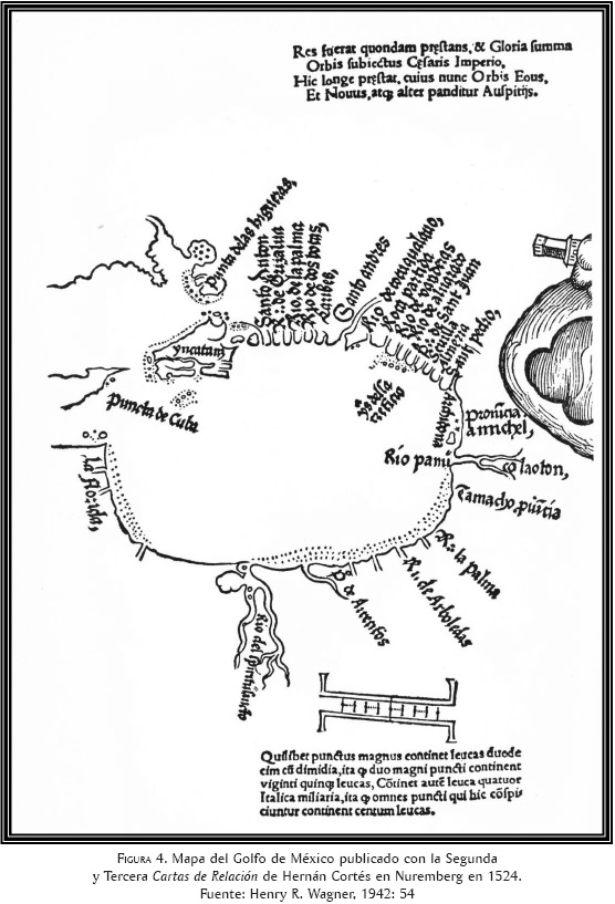 El otro es el muy conocido grabado que acompañaba la edición latina impresa en Nuremberg, en 1524, de la segunda y tercera Cartas de Relación de Hernán Cortés al emperador, fechadas en 1520 y 1522. Consta de dos secciones: una representa el contorno del Golfo y la otra la ciudad de Tenochtitlan rodeada por su laguna. En la primera se señalan con el nombre dado por los exploradores varios accidentes geográficos, sobre todo las desembocaduras de los ríos, desde la Punta de las Higueras hasta la Florida, además del cabo occidental de Cuba en medio de los dos extremos. Aquí Yucatán aparece dibujado como una isla de contorno caprichoso, más detallada en la costa norte. Cozumel se distingue por su tamaño, junto a otras más pequeñas. Cerca de Cabo Catoche se marcan dos isleos como para representar Isla Mujeres. A la entrada de la Laguna de Términos se señala la Isla del Carmen y se delinea la península de Atasta como si se tratara de otra isla de mayores dimensiones. Al comparar este mapa con la relación del viaje de Grijalva, los puntos de acuerdo entre el texto y la imagen resultan sorprendentes, sobre todo en la parte correspondiente a la Laguna de Términos, pues su disposición además concuerda con el testimonio de los naturales (figura 4).44