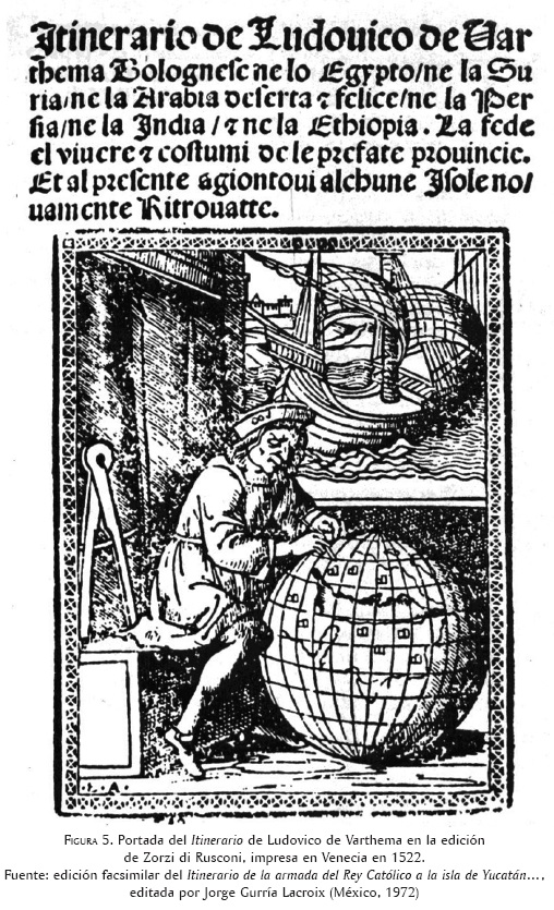 Se ignora cómo este relato, o con más probabilidad una copia del mismo, llegó a manos del conocido editor milanés Zorzi o Giorgi di Rusconi, que lo publicó en Venecia, traducido al toscano, en una fecha tan temprana como fue el 3 de marzo de 1520.53 Entonces, la relación apareció incorporada como complemento del Itinerario de Ludovico de Varthema. Una crónica difundida en numerosas ediciones y traducciones, desde la impresa en Roma en 1510, donde este aventurero boloñés, famoso a consecuencia del viaje que había realizado entre 1503 y 1508 por distintas regiones de África y Asía, narraba su paso por Egipto, Siria, Arabia, Persia, Etiopía y la India; con la visita a algunos lugares nunca antes conocidos por los europeos, como La Meca. El publicista Rusconi, que ya había probado la buena aceptación de la obra del viajero italiano al estampar una edición en 1517 y otra en 1518, debe haber pensado conveniente, atractivo para los lectores y redituable para su imprenta, el añadir a la descripción de esos países exóticos una reseña acerca de las islas nuevamente encontradas, sobre todo si todavía las consideraba tan cercanas a aquellas regiones del Viejo Mundo (figura 5). Además, resulta comprensible que, en consonancia con el título de la obra de Varthema, haya compuesto el del informe, que así, por voluntad creativa del editor, se publicó como otro itinerario, el de la armada del rey católico a una isla llamada Yucatán en la India.