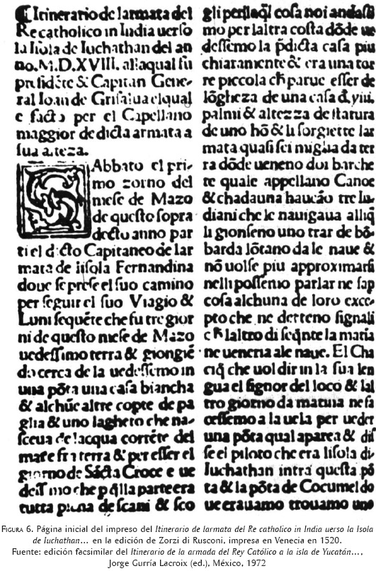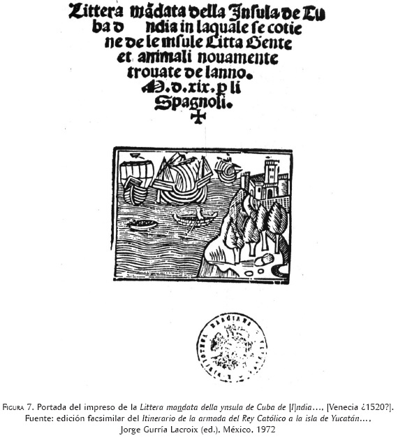 60 Este impreso fue localizado por Harrisse en la Biblioteca Marciana de Venecia. Lo registra con el número 60 en las páginas 75 y 76 de Additions. Federico Gómez de Orozco lo consideraba el más antiguo acerca del descubrimiento de México y Wagner, años después, propuso que su publicación había sido anterior a la del Itinerario. Gurría ofrece estos datos pero, dados los errores de cronología que presenta el texto, se inclina por creerlo posterior a 1520 [Introducción] en Carta enviada desde la isla de Cuba…, pp. 7-8. La traducción al español es de Assunta Angelucci. Uno de los cambios introducidos por ella fue trasuntar los términos insula, isola o insola, por la palabra "península", cuando se refería a Yucatán, sin percatarse de la confusión que generaría cuando su texto se tomara como fuente de conocimiento histórico. Ibid., pp. 28-29.