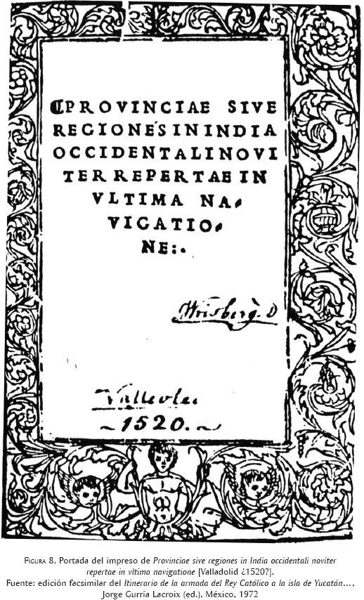 5 La traducción de García Icazbalceta, sin sus notas, ha sido reimpresa en 1939, 50, 63 y 87, en la antología Crónicas de la Conquista, preparada por Agustín Yáñez como vol. 2 de la Biblioteca del Estudiante Universitario de la UNAM; el 1 de enero de 1958 por Carlos R. Menéndez en el Diario de Yucatán y por Jorge Gurría. Este historiador, con base en los registros proporcionados por Henry Harrisse en su Bibliotheca Americana Vetustissima. Description of Works relating to America published between the years 1492 and 1551. New York: Geo. P. Philes, Publisher, 1866, y en Additions. Paris: Libraire Tross, 1872, publicó los facsímiles de cinco impresos del siglo XVI donde se da cuenta de las primeras exploraciones sobre las costas del territorio que se llamaría la Nueva España, seguidos de sus respectivas traducciones y precedidos con notas introductorias compuestas por el mismo editor, bajo el sello editorial de la Colección Juan Pablos, entre 1972 y 1973. El Itinerario es el número I y apareció con el título registrado por García Icazbalceta, el II corresponde al opúsculo Provincias y regiones recientemente descubiertas en las Indias Occidentales, en el último viaje, el III a la Carta enviada desde la isla de Cuba, de India, en la cual se habla de ciudades, gentes y animales encontrados nuevamente en el año de 1519 por los españoles; el IV reproduce el Epítome de Pedro Mártir de las islas recientemente descubiertas bajo el reino de don Carlos y de las costumbres de sus habitantes. Dedicado a Doña Margarita, hija del ínclito Emperador Maximiliano; en el quinto y último apareció la Nueva noticia del país que los españoles encontraron en el año de 1521, llamado Yucatán, impreso alemán de 1522, al parecer basado en el Epítome.