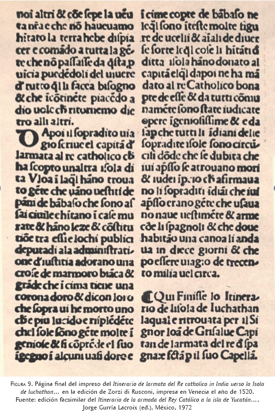 El capellán aparece mencionado en los tres opúsculos, pero en el interior de los relatos sólo está presente cuando se narra el episodio del desembarco en Cozumel, donde celebró una misa. Entonces, aunque el autor escribe en primera persona, se refiere al clérigo como si estuviera tratando de otro individuo. De los tres impresos, el único que señala al capellán mayor de la armada como autor de la relación es el Itinerario. Ya he explicado que la causa de semejante atribución debe encontrarse en la confusión del editor, o con mayor seguridad de su fuente española, entre el autor de la relación y el encargado de llevar y entregar el documento en la Corte, éste sí, un conocido capellán. La autoría sólo se registra en el título y en una frase con la cual se cierra el último parágrafo. Respecto del encabezamiento, he mencionado antes cómo resulta evidente haber sido compuesto por Rusconi en consonancia con el título del libro de Varthema, al que se adjuntó en calidad de anexo para su publicación. En cuanto a la mención final, ésta concluye unas líneas añadidas después del resumen del informe de Grijalva, también agregado por el impresor, pues rompe con el estilo de la redacción del texto y tampoco se encuentra en la Littera ni en Provinciae. Además, desde el punto de vista tipográfico, esos renglones donde se anuncia el fin del Itinerario, aunque aparezcan fuera del lugar que les correspondería, permitieron al formador emparejar las columnas del texto, para dar a la página una mejor presentación (figura 9).