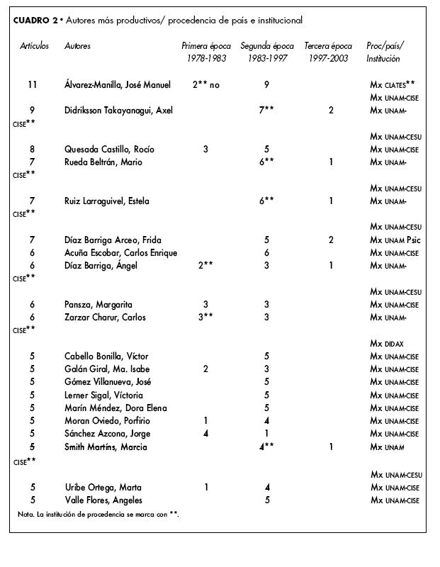 En el cuadro 2 se reportan los autores cuyas contribuciones corresponden a más de cinco artículos, todos ellos, con excepción de Frida Díaz Barriga, fueron en su momento investigadores del CISE y algunos siguen formando parte de los académicos del CESU.