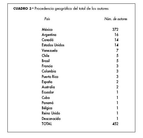 En cuanto a la procedencia geográfica de los 452 autores, se advierte que la gran mayoría (372, 82.3%) son de México, de ellos sólo 36 provienen de provincia, en tanto que 336 estuvieron adscritos a instituciones educativas del Distrito Federal. De procedencia internacional se localizaron 80 autores (17.7%), de los cuales 16 son de Argentina, 14 de Canadá, 14 de Estados Unidos, 7 de Venezuela, 5 de Chile, 5 de Brasil, 3 de Colombia, Francia y Puerto Rico, 2 de España, 2 de Australia y 1 de Ecuador, Cuba, Reino Unido, Panamá y Bélgica (véase cuadro 3).