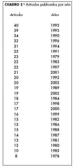Con menor número están representados los siguientes años: 1991 con 25, 1979 con 23, 1983 y 1997 con 22 artículos en cada año, 2001 con 21, 1992 y 2003 con 20, 1989 y 2002 con 19, 1984 con 18, 1998 y 2000 con 17, 1999 con 16, 1982, 1986 y 1988 con 15, 1987 con 14, 1981 con 13, 1985 con 10 y 1978 con únicamente 8 artículos. Es importante considerar que en la tercera época (19972003) los artículos en su mayoría son extensos, resultado de investigaciones empíricas, trabajados con mayor profundidad.