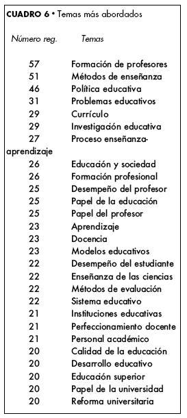 Se observa que hay gran diversidad temática: de los 575 temas que se reportan con relación a los 537 artículos de Perfiles Educativos, 68 temas tienen frecuencias de más de 10 veces. Los aspectos educativos más estudiados son los relacionados con la docencia, entre ellos están: formación de profesores con 57 artículos, seguido por métodos de enseñanza 51, currículo 29, proceso enseñanzaaprendizaje 27, formación profesional 26, desempeño del profesor, papel del profesor y papel de la educación con 25 artículos cada uno, docencia, aprendizaje, modelos educativos con 23 artículos cada uno. Otras temáticas importantes abordan política educativa 46, investigación educativa 29, problemas educativos 31, educación y sociedad 26, calidad de la educación, reforma universitaria, educación superior, papel de la universidad, con 20 artículos por cada tema.