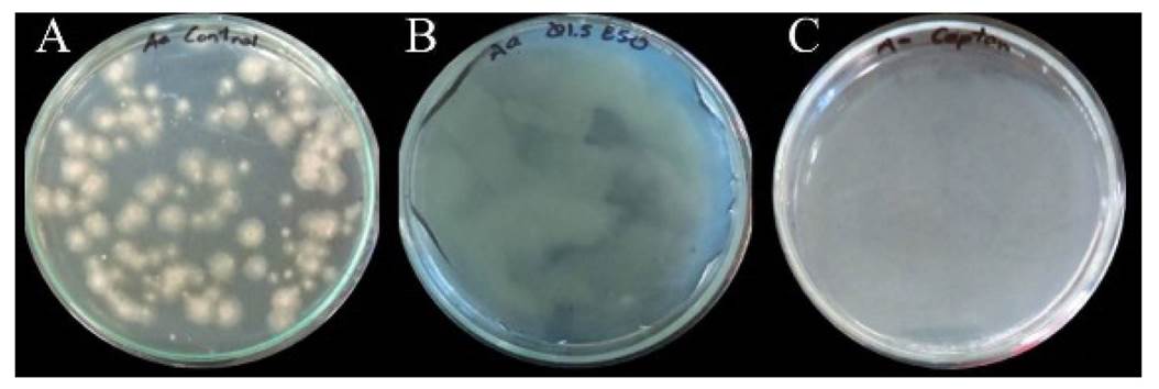 For the conidia germination trials, it was used the mixture that displayed the most statistically significant mycelial inhibition in vitro (%)*=p≤0.05. Distilled water was included as a negative control, and Captan (0.25% w/v) as a positive control, with 6 repetitions for each treatment. It was placed 0.5 mL of each treatment on the surface of the Petri dishes with PDA, spread it out evenly, left it to dry for 5 to 10 min, inoculated using a conidial suspension (0.1 mL) (106 mL-1) and incubated at 25±2 °C for 4 days, and the percentage of conidia germination was determined.