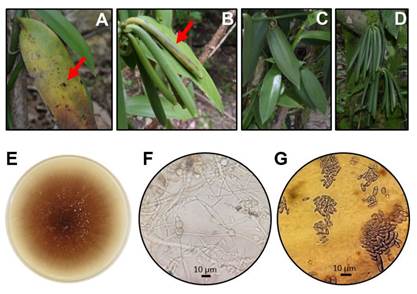 Figure 2. Infection symptoms observed on vanilla plants cultivated in the southern Huasteca Potosina, and images of the isolated Fusarium fungus. A: Vanilla leaf with chlorotic and necrotic spots (red arrow). B: Vanilla fruits with chlorosis and important areas with necrosis (red arrow). C and D: Leaves and fruits of vanilla plants with no infection symptoms. E: Fusarium growth in PDA medium and in darkness. F: Fusarium mycelium and chlamydospores. G: Fusarium microconidia.