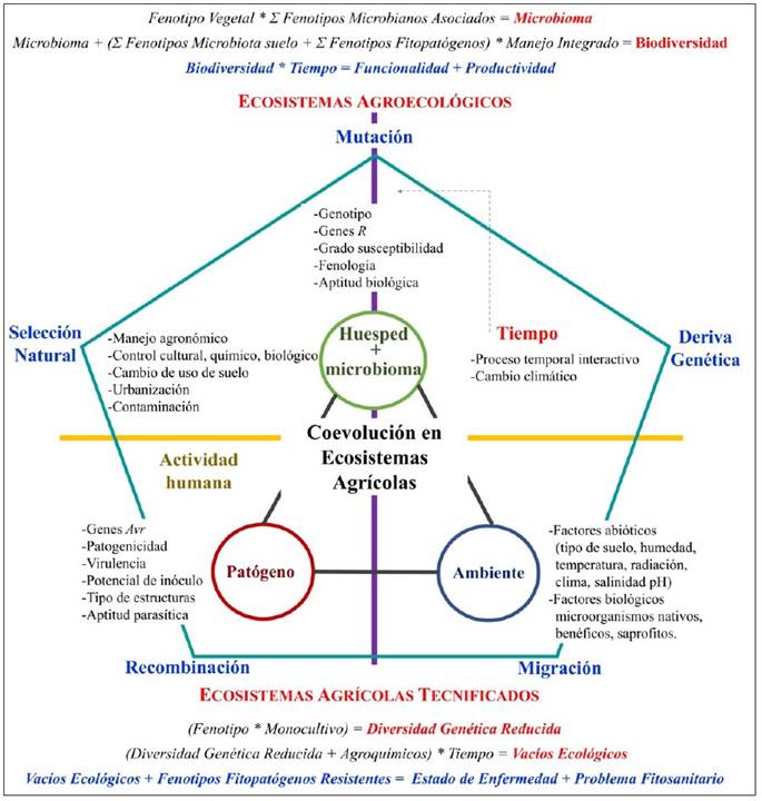Hospederos y microorganismos han co-evolucionado a través del tiempo hasta establecer relaciones simbióticas altamente especializadas. Ambos simbiontes, inmersos en la carrera evolutiva han desarrollado, por parte de los hospederos, mecanismos ‘colaborativos’ o de defensa, y por parte de los microorganismos mecanismos que les permiten adaptarse como mutualistas o como patógenos (Hassani et al., 2018; Matveeva et al., 2018). Esta coevolución esta limitada o potencializada por las condiciones ambientales y antropogénicas, y afectan notablemente el equilibrio entre las poblaciones mediante un mayor grado de presión selectiva. De esta manera, hospederos, microorganismos y otros seres vivos asociados al nicho ecológico estan sujetos a una adaptación continua necesaria para su definir su rol dentro del agroecosistema (Thrall et al., 2011) (Figura 2). El proceso de coevolución tiene como elemento fundamental la reciprocidad genética; es decir, que cuando un organismo desarrolla un caracter como respuesta adaptativa hacia un factor que afecta su aptitud biológica, la contraparte biológica responderá generando otro carácter(es) que les permitirán adaptarse al nuevo caracter desarrollado por el primer organismo y así suscesivamente (McDonald, 2004). La generación de estos caracteres o fenotipos se rige por diferentes fuerzas evolutivas (Zhan, 2016; McDonald, 2004); así hospederos, microorganismos y otros organismos asociados a los sistemas agrícolas co-evoluciona adaptándose a su medio, sí la acción antropomorfica garantiza el tiempo como factor de evolución. En condiciones de biodiversidad y equilibrio ecológico, por cada caracter generado, se generan otros caracteres que lo atenuan y pueden mantenerse un equilibrio, un estado de salud. En condiciones de disbiosis, como las que se presentan en un sistema agrícola tecnificado, existen vacíos ecológicos (p.e., los ocasionados por los agroquímicos), que ocasionan la sobrevivencia de un pequeño grupo de individuos, los cuales encontrarán formas de alimentarse y que eventualmente conducen a un estado de desequilibrio o estado de enfermedad (Figura 2). Además, las prácticas culturales y los ciclos biológicos acelerados de la agricultura tecnificada, y el impacto de la urbanización, contaminación y cambio climático sobre esta, ejercen una fuerte presión selectiva sobre ciertos grupos de organismos benéficos, dificultando su establecimiento a nivel micro y macroambiente (Figura 2) (Tooker et al., 2020). Al analizar bajo este punto de vista al sector agroalimentario tecnificado, resulta paradógico cuestionar porque actualmente se encuentran patógenos de humanos, animales y plantas resistentes a multiples factores, que ciclo con ciclo productivo resultan más dificiles de controlar (Tooker et al., 2020; Brown y Tillier, 2011). Es necesario diferenciar los sistemas productivos tecnificados, generalmente monocultivos extensivos, algunos con variedades transgenicas (p.e. de soya resistente al glifosato o el maiz resistentes a plagas mediante el gen Bt) de aquellos tradicionales, subsistencia u orgánicos, los cuales tiene un menor o nulo impacto en los sistemas microbianos del suelo y vegetal (Nota del Editor).