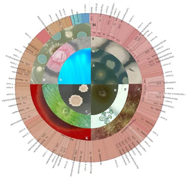 Figura 4 Cepas microbianas mexicanas en proceso de caracterización para su incorporación a la Colección de Microor ganismos del CNRG INIFAP. A) Pseudomonas sp. con capacidad lipolítica; B) Trichoderma sp. con capacidad lignolítica; C) colonia de Bacillus subtilis; D) Pseudomonas fluorescens bajo luz ultravioleta; E) Pseudomonas protegens con capacidad solubilizadora de fosfatos; F) Estructuras de Trichoderma sp. observada al microscopio; G) Trichoderma sp. con capacidad promotora de crecimiento vegetal; H) Bacillus sp. reduciendo el crecimiento de Fusarium sp; I) Bacillus amilolyquefaciens; J) colonia de Fusarium boothii; K) Trichoderma sp. con capacidad celulolítica; L) Pseudomonas sp. reduciendo el crecimiento de Aspergillus sp; M) Estudio exploratorio preliminar de metatrascriptoma asociado a chile (Capsicum sp).