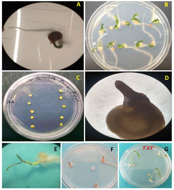 Figura 2 Pruebas de patogenicidad de P. aphanidermatum en semillas y plántulas de chile serrano. A) Tratamiento testigo, semilla de cinco días después de la siembra (dds), B) Tratamiento testigo 12 dds, C) Semillas inoculadas con P. aphanidermatum cinco días después de la inoculación (ddi), D) Semilla inoculada con P. aphanidermatum de 12 ddi, E) Necrosis de los cotiledones y abundante micelio en la raíz 3 ddi, F) Necrosis total de las plántulas 5 ddi, G) Tratamiento testigo con plántulas sin síntomas.