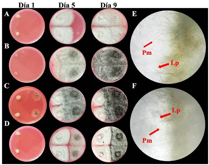 Los resultados del tratamiento de inoculación dual no presentaron diferencias en la coloración del micelio de P. mangiferae MN2 y L. pseudotheobromae S10. Se observó en el séptimo día la presencia de conidiomas en P. mangiferae MN2 cuando se inoculo dos días antes que L. pseudotheobromae, las inoculaciones individuales no presentaron las estructuras. En las placas inoculadas dos días después se observó un auto emparejamiento en el crecimiento de ambos hongos. En las microfotografías se observó un cruzamiento entre las hifas de ambas especies (Figura 2E-F). No se observaron halos de inhibición en la zona de contacto entre P. mangiferae MN2 y L. pseudotheobromae S10 (Figura 2A-D).
