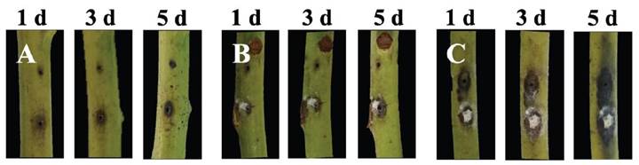 Cuadro 2 Coinfección de Pestalotiopsis mangiferae MN2 y Lasiodiplodia pseudotheobromae S10 en ramas después de 5 días.