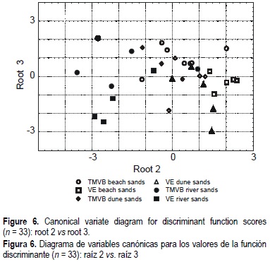 The Qt-Ft-Lt ternary plots of beach, dune and river sands are shown in figure 4. Overall, the TMVB and VE sands are feldspatholithic (Qt30Ft24Lt46). Furthermore, significant differences between the overall composition of the TMVB and VE sands, in percent values (table 1), were determined. This was carried out with a one-tailed t-test for Qt, Ft, Lt, Lv and Ls, in which the null-hypothesis of equal means is rejected between the TMVB and VE sands for quartz abundances (tobserved = 2.09, df = 31, p = 0.05, n = 33, tcritical = 1.69). Additionally, the LDA results show, from the partial lambda values, that the best variables that discriminate between the TMVB and VE sands are the Log Qt/Ft, Log Qt/Lt, Log Ft/Lt and Log Lv/Ls ratios (table 3). Moreover, the best canonical score plots were between canonical variate 1 vs canonical variate 2 (root 1 vs root 2) and canonical variate 2 vs canonical variate 3 for the dune and river TMVB and VE sands (figs. 5, 6). The best separated groups were the TMVB river sands distinct from the VE river sands, followed by the TMVB beach sands distinct from the VE beach sands, and the TMVB dune sands distinct from the VE dune sands (fig. 5). Discrimination between the TMVB and VE beach, dune and river sands is controlled by the Log Qt/Ft, Log Qt/Lt, Log Ft/Lt and Log Lv/Ls ratios. However, a comparison of means test may elucidate the contribution of the variable in terms of separate groups. Therefore, an A-Nova test and post-hoc Tukey comparison of means test were carried out, and we found that the TMVB and VE dune and river sands are significantly different when applying these tests (table 4). Moreover, factor 1 grouped the Log Qt/Ft, Log Qt/Lt, Log Qm/Fk, Log Qm/Fp and Log Lv/Ls ratios, and Mz as high variable loads for the TMVB sands (table 5). Additionally, factor 1 grouped the Log Qt/Ft, Log Qt/Lt, Log Ft/Lt, Log Qm/Fp and Log Lv/Ls ratios for the VE sands. This suggests that the composition of the TMVB beach, dune and river sands is controlled by the Log Qt/Ft, Log Qt/Lt, Log Qm/Fk, Log Qm/Fp and Log Lv/Ls ratios, as well as Mz, and that the VE sand composition is controlled by the Log Qt/Ft, Log Qt/Lt, Log Ft/Lt, Log Qm/Fp and Log Lv/Ls ratios (table 5). Nevertheless, only the Log Qt/Ft, Log Qt/Lt and Log Lv/Ls ratios are the three significant variables entered in the LDA that contribute to separate among TMVB and VE dune and river sands. These results are based on the overall statistical significance of the LDA, A-Nova, post-hoc and FA tests for the three most common significant variables entered in the analyses (i.e., Log Qt/Ft, Log Qt/Lt and Log Lv/Ls ratios) (tables 3, 4, 5).