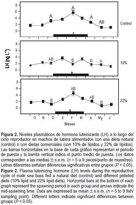 En conclusión, en este trabajo se presentan por primera vez los datos de las variaciones estacionales de LH en machos de lubina. Contrariamente a lo observado previamente en hembras (Navas et al., 1998), en los machos no se observa una influencia marcada de la composición en ácidos grasos de la dieta sobre los niveles plasmáticos de LH, lo que sugiere que hay diferencias intersexuales en los mecanismos que controlan la producción y liberación de LH.